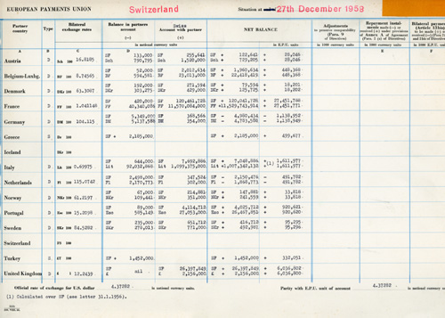 Monthly overview summarising Switzerland's balance of payments position vis-à-vis other EPU member states, December 1958. The BIS provided accounting services to the EPU and acted as its agent.