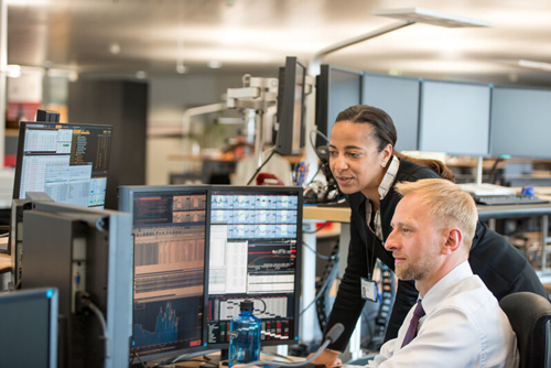 Staff members working in the BIS dealing room. There are dealing rooms in Basel as well as in the Representative Offices in Hong Kong SAR and Mexico City.