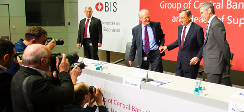 Press conference by the Basel Committee on Banking Supervision in 2017 presenting the Basel III reform package. On the right: Stefan Ingves (Governor Sveriges Riksbank and Chair BCBS), Mario Draghi (President ECB) and William Coen (Secretary General BCBS).