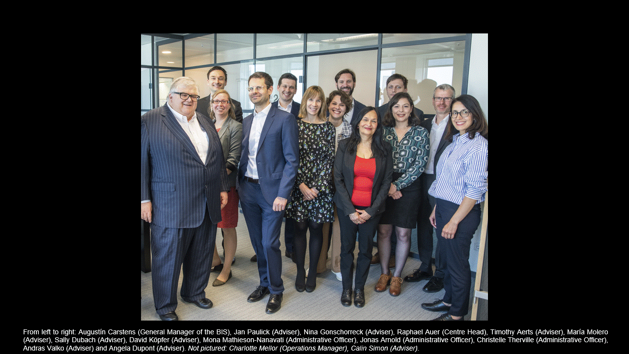 From left to right: Agustín Carstens (General Manager of the BIS); Jan Paulick, Nina Gonschorreck (Advisers); Raphael Auer (Centre Head); Timothy Aerts, María Molero, Sally Dubach, David Köpfer (Advisers); Mona Mathieson-Nanavati, Jonas Arnold, Christelle Therville (Administrative Officers); Andras Valko and Angela Dupont (Advisers). Not pictured: Charlotte Mellor (Operations Manager), Calin Simon (Adviser).
