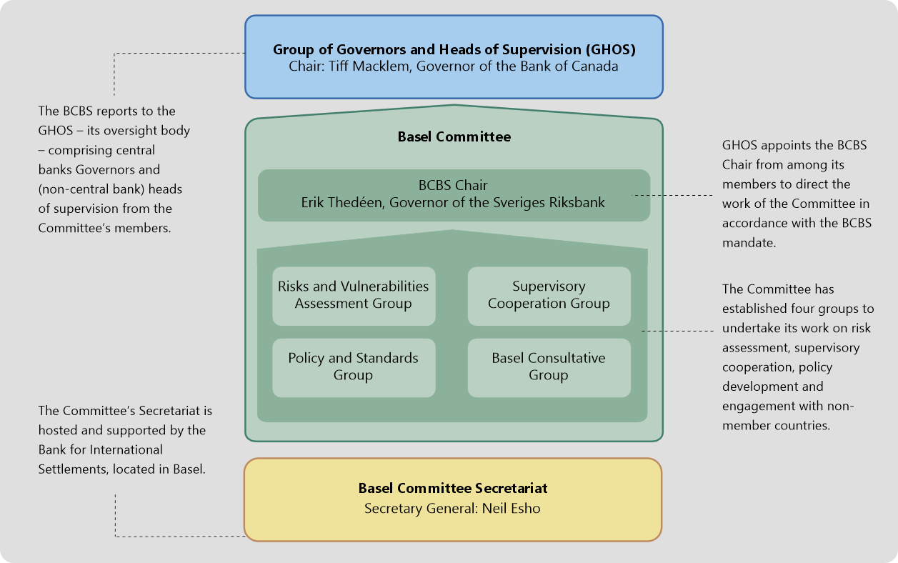 The governance structure of the Basel Committee comprises a chair, standing groups focused on risk assessment, supervision, standard-setting and outreach, and the Secretariat hosted by the BIS. The BCBS reports to the Group of Central Bank Governors and Heads of Supervision (GHOS) - its oversight body - and seeks its endorsement for major decisions.